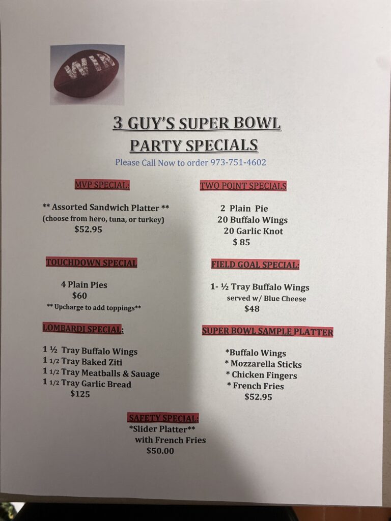 Our menu features a wide variety of pizzas, including classic favorites like pepperoni and cheese, as well as more unique options like our signature 3 Guys Special, loaded with an assortment of meats, veggies, and fresh mozzarella.